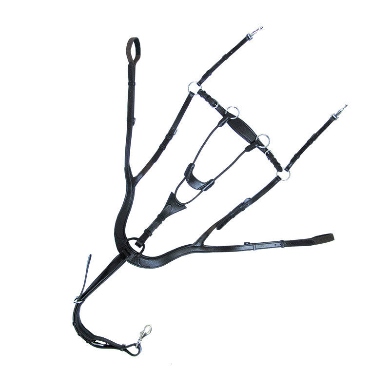 Martingalgabel. Mit Ziernähten. Mehrfach verstellbar und weich gepolstert. Ohne Elastzonen. Passend zu den Trensen „Lorenz“