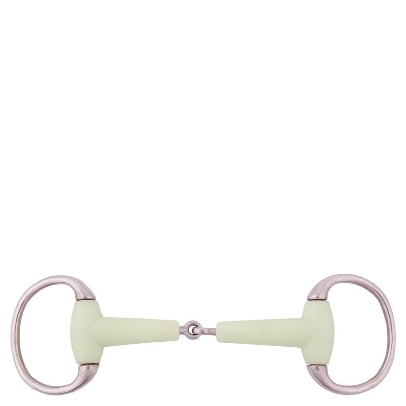 Einfach gebrochene Olivenkopftrense mit Apple Mouth Mundstück und Edelstahlringen von 65 mm. Gebissdicke von 18 mm.