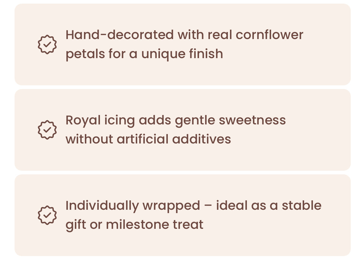 Ein außergewöhnliches Pferdeleckerli, das kleine Alltagsmomente in etwas ganz Besonderes verwandelt. Inspiriert von feiner Pâtisserie, wird dieses handdekorierte Leckerli mit veganem Royal Icing überzogen und mit echten Kornblumenblüten veredelt – ein natürlicher Akzent, der es einzigartig macht.