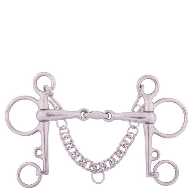 Doppelt gebrochenes Mundstück, Edelstahl massiv, Länge der beweglichen Anzüge: 140 mm. Gebissdicke von 18 mm.