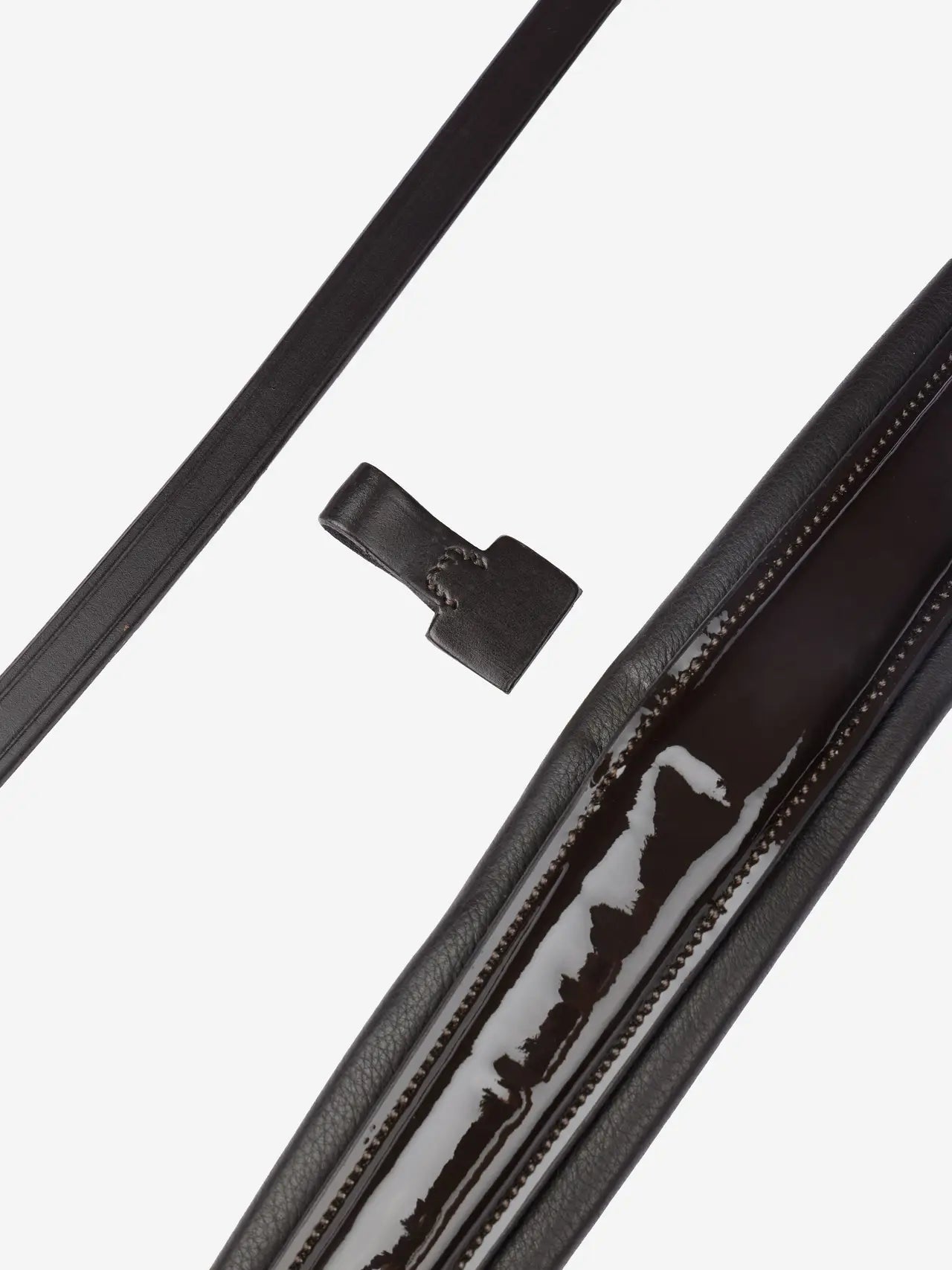 Dieses spezielle Dressurzaumzeug ist aus hochwertigem, vorgeöltem italienischem europäischem Leder gefertigt und verfügt über gerollte Abschnitte und ein abnehmbares, kombiniertes Nasenband. Das anatomisch geformte, gepolsterte Genickstück bietet bequemen Freiraum hinter den Ohren und verteilt den Druck gleichmäßig über das Genick. Das abnehmbare Clincher-Stirnband ist konturiert, gepolstert und mit Kristallen verziert für anspruchsvollen Komfort. Das patentierte Kurbelnasenband ist hervorragend gepolstert. Rollschnallen am Kurbelriemen und am kombinierten Nasenband ermöglichen eine präzise Anpassung für eine sensible Kontrolle. Dies ist ein Statement-Stück, das Ihrem Look eine subtile, dressurgeprüfte Eleganz verleiht.