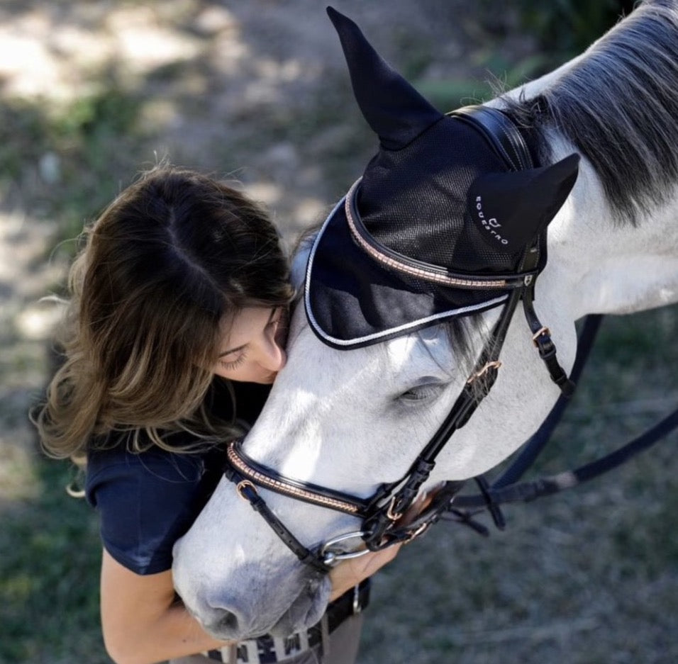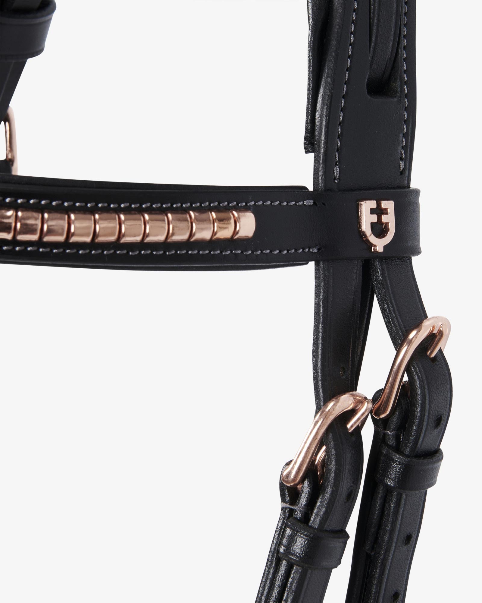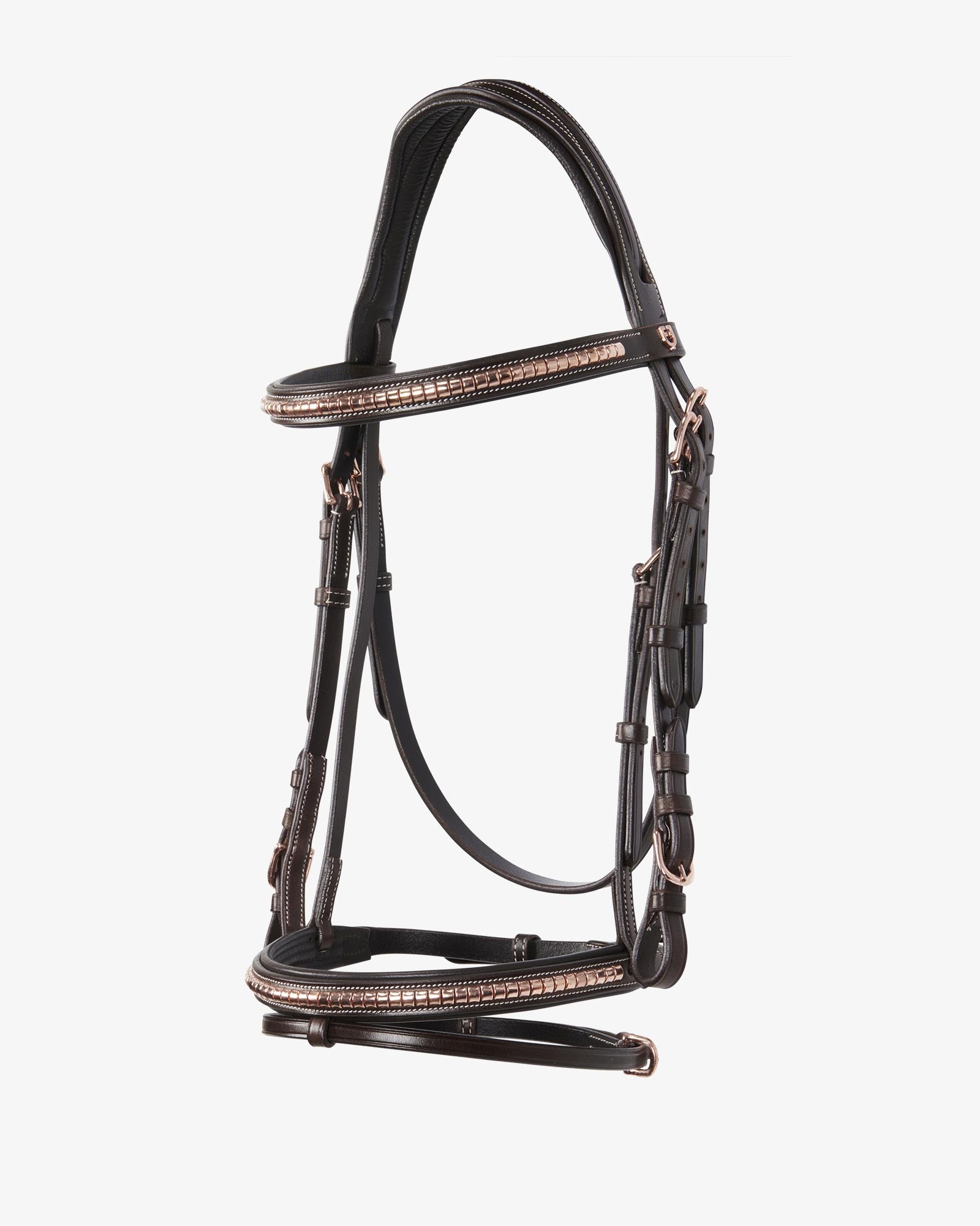 Trense mit Clincher von der italienischen Firma Equestro.Sehr sehr gute Lederqualität.Komb. Reithalfter mit Clincher sowie Stirnriemen mit Clincher. Anatomisches Genickstück. Reithalfterführung über dem Genickstück. Zum Teil mit hellen Nähten abgesteppt. Super Lederqualität. Ohne Zügel.