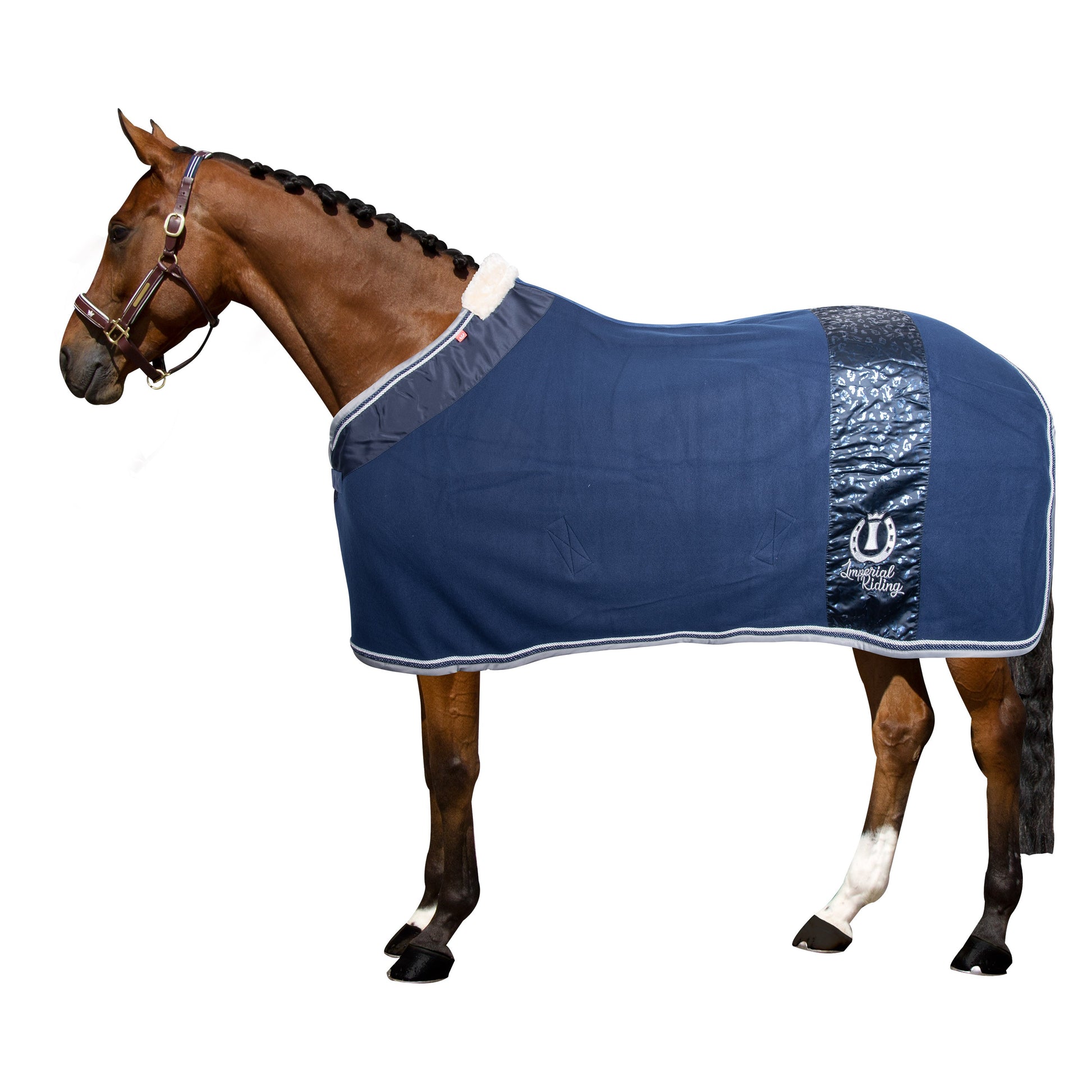 Fleecedecke aus unserem schicken Set AMBIENT. Die Decke hat Kontrastteile im Satin-Look. An der Hinterseite der Decke befindet sich ein glitzernder Allover-Print mit Leopardenmuster und darauf eine sehr luxuriöse ‚Imperial Riding‘-Verzierung. Um die gesamte Kante der Decke herum befindet sich eine Kordel und eine glitzernde Einfassung. An der Vorderseite der Decke befindet sich ein D-Verschluss, am Bauchteil D-Kreuzgurte und hinten eine Schweifkordel.