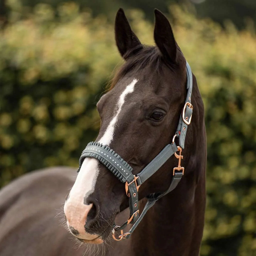 - verspielte Raffungen am Nasenriemen und Strasssteine machen das Halfter zu einem Blickfang