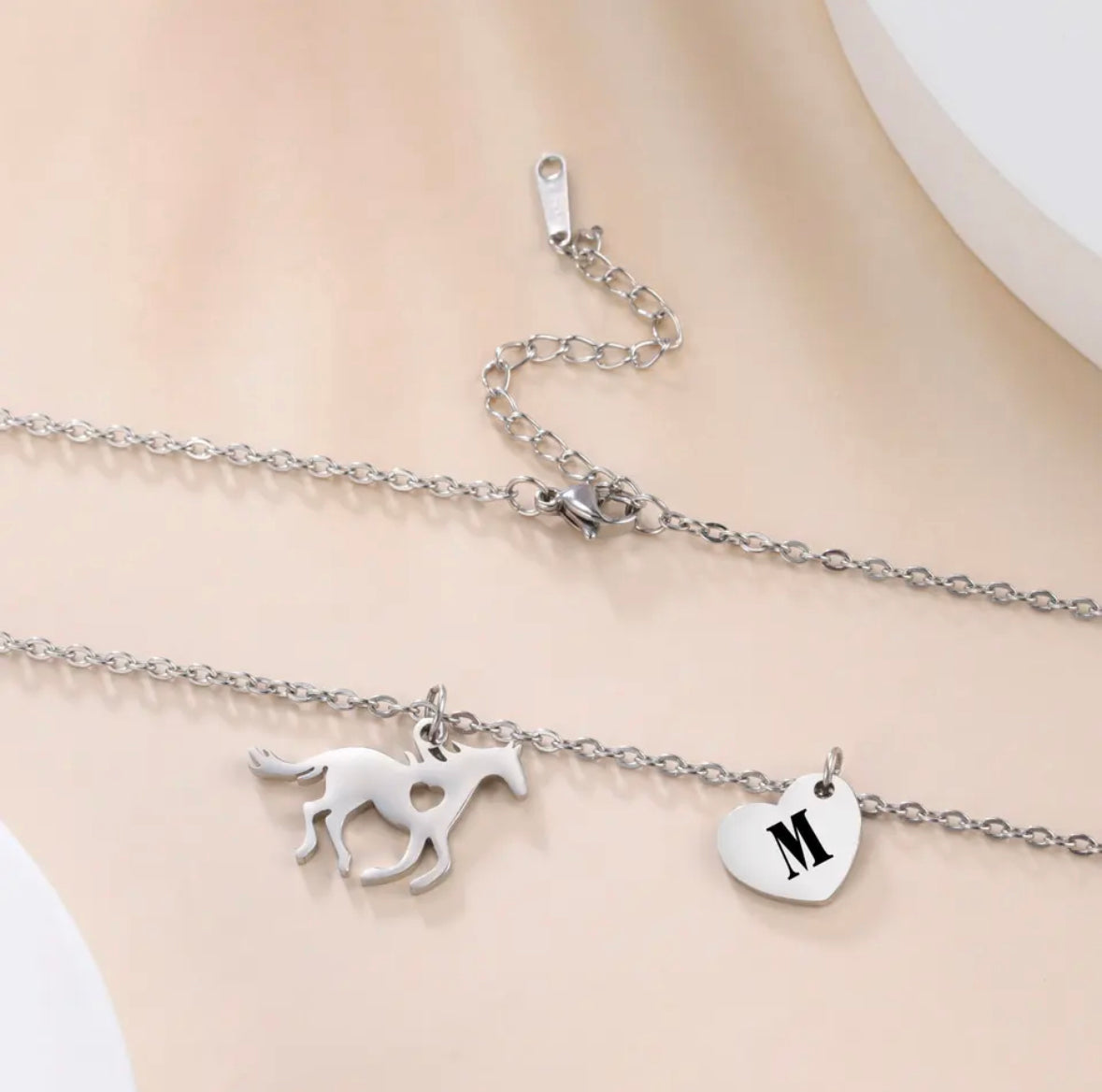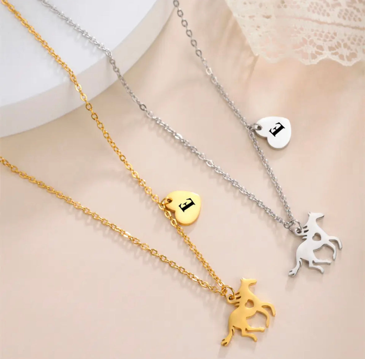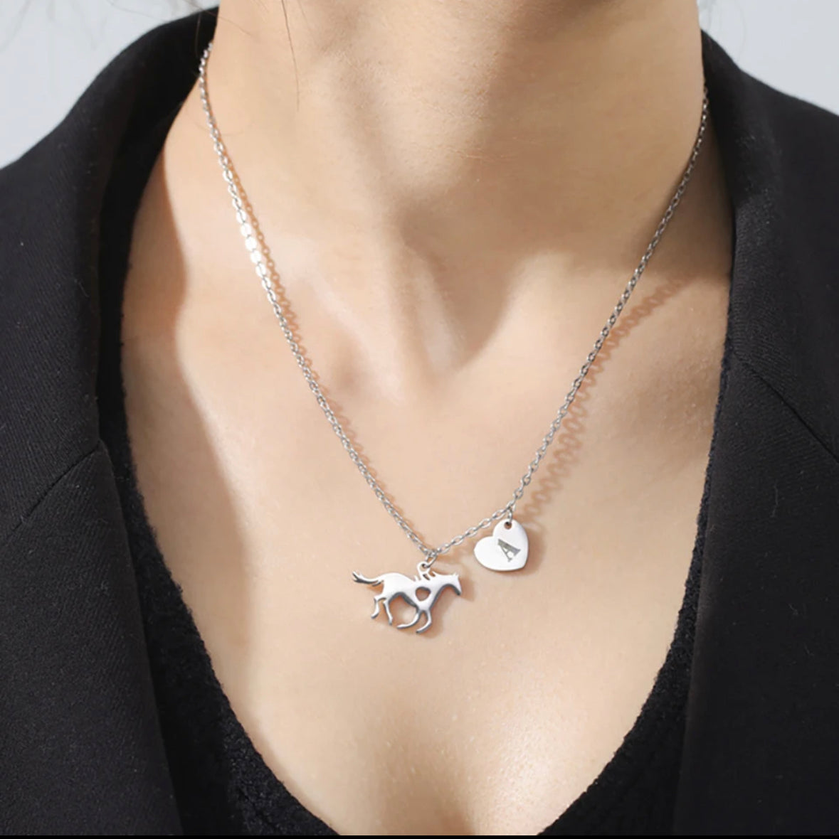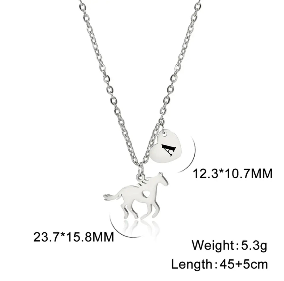 Hochglanzpolierte Edelstahlhalskette mit Pferdeanhänger und einem extra Charm mit dem Anfangsbuchstaben deines Pferdes