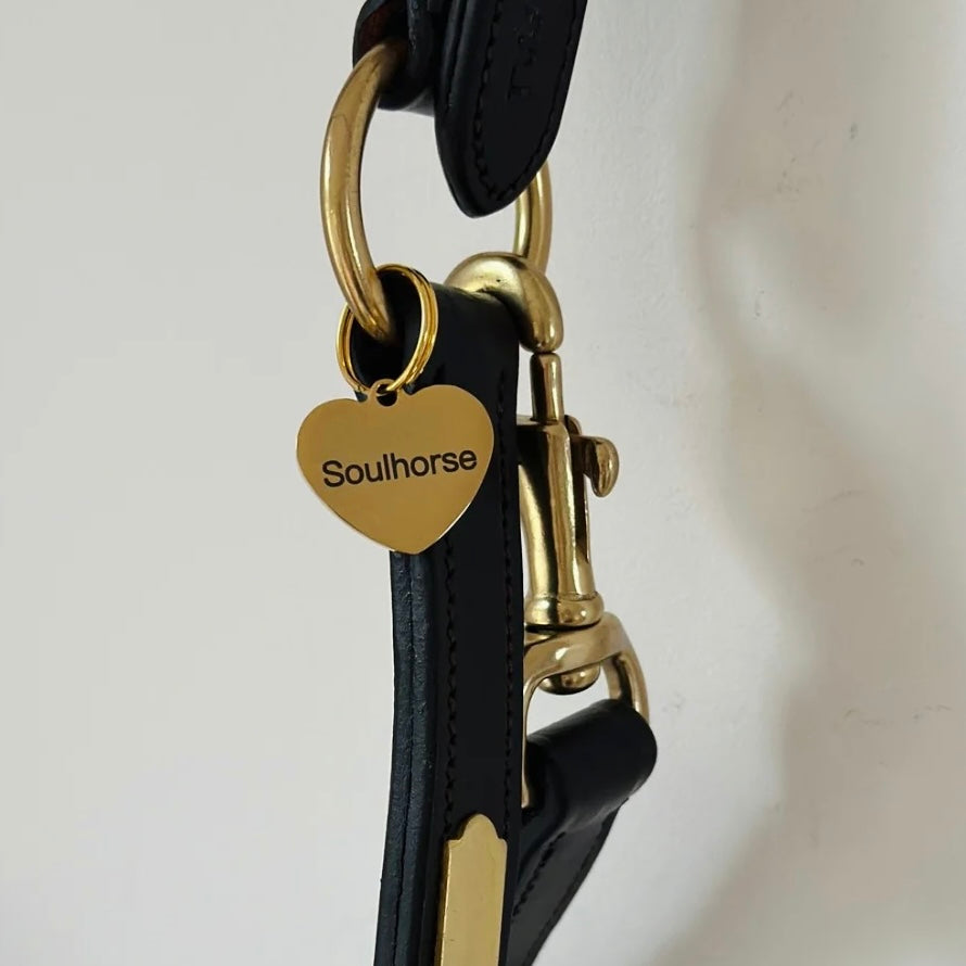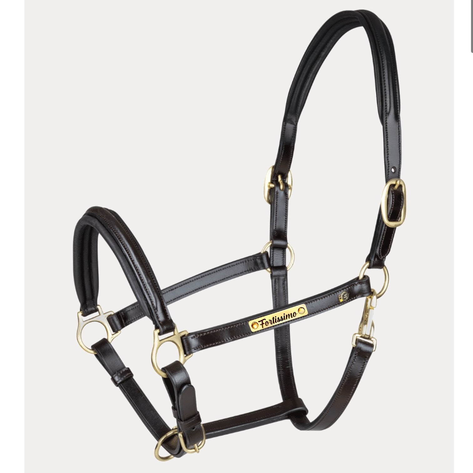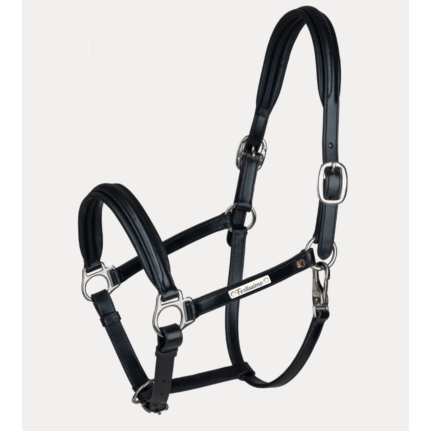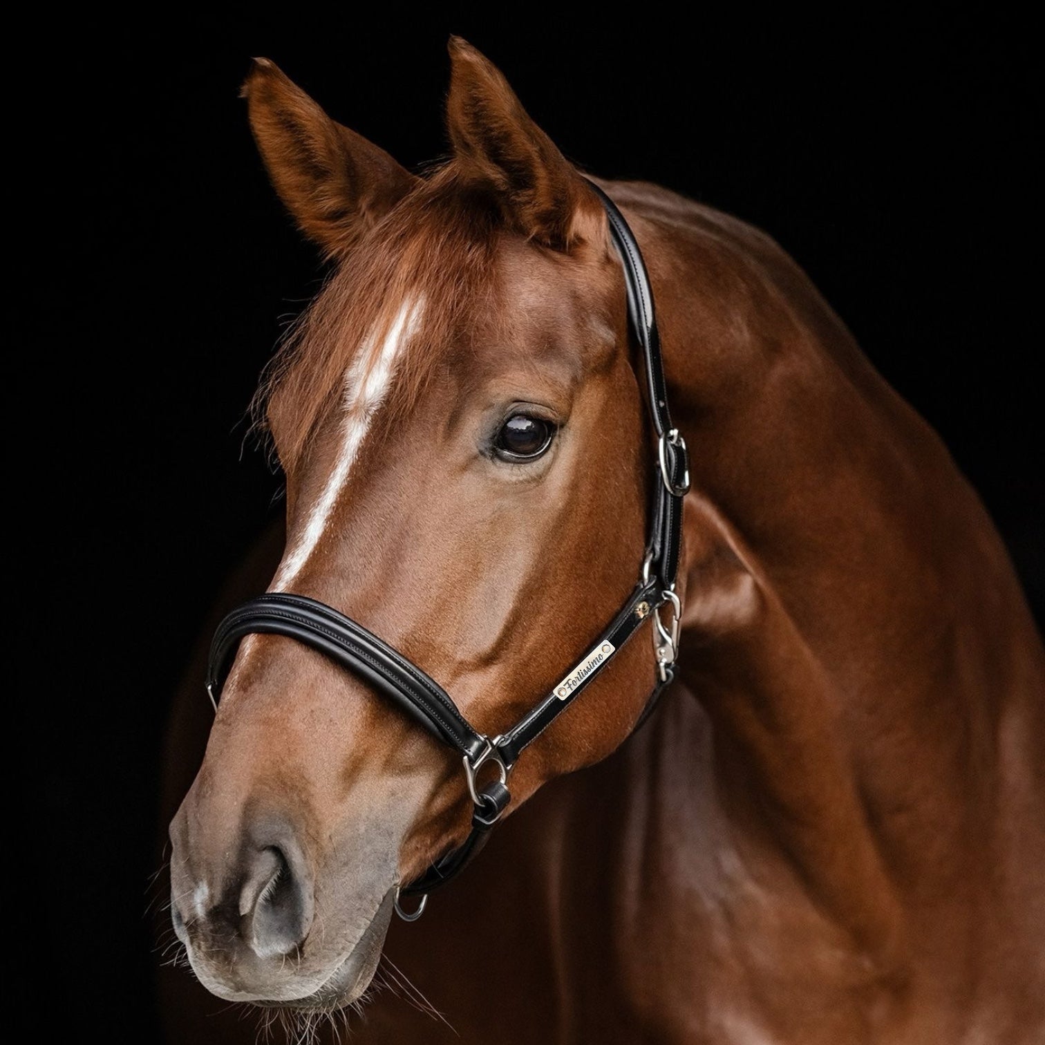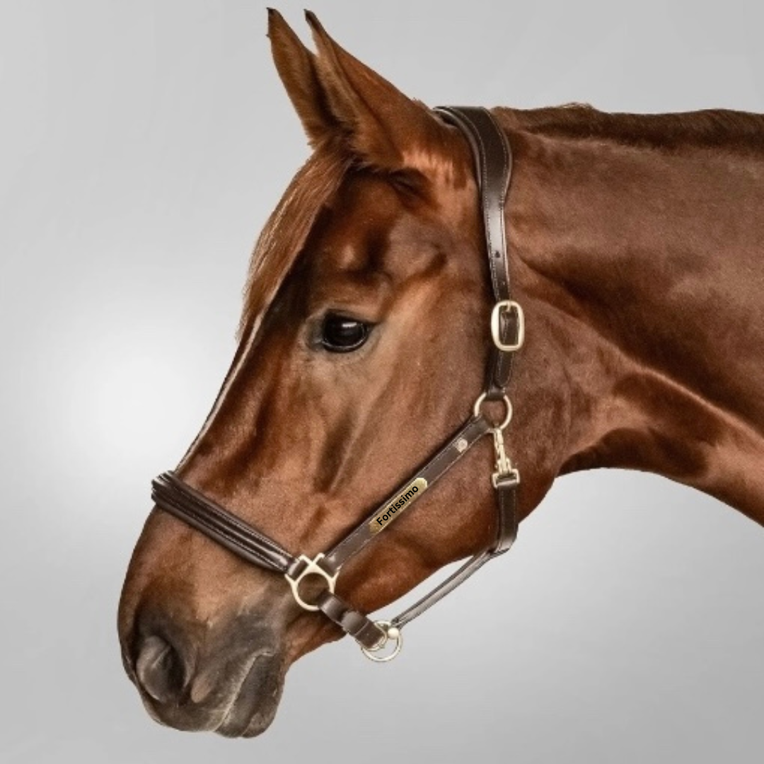 Elegantes Lederhalfter mit weich gepolstertem Nasenriemen und Genickstück. Beidseitig verstellbares Genickstück und einfach verstellbarer Kinnriemen. Messingbeschläge
