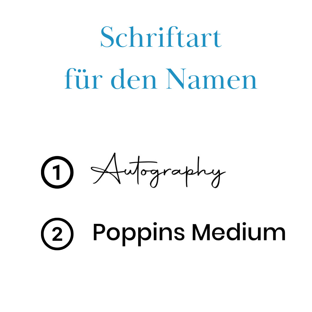 Die untere Zeile kannst du mit deinem Wunschtext oder Geburtsdatum personalisieren. Diese Zeile wird in derselben matten Schrift geschrieben wie der Name
