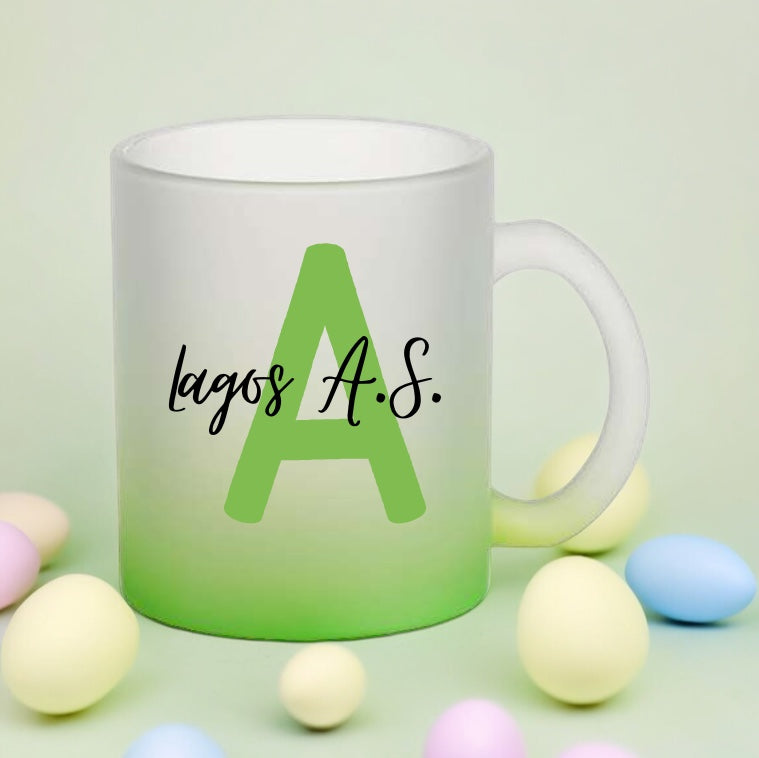 Einzigartige satinierte ombré Glastasse mit dem Anfangsbuchstaben und darüber dem Namen deines Pferdes oder Lieblingsmenschen