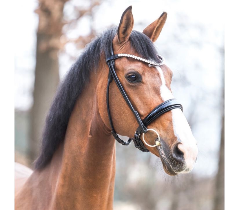 Aus hochwertigem deutschen Qualitätsleder besticht der Trensenzaum "Florina KavalSH4" durch seine Eleganz: Die rundgenähten Seitenriemen, das geschwungende Stirnband mit großen weißen Strasssteinen und der breite Nasenriemen mit Lack lassen die Trense an jedem Pferdekopf einzigartig aussehen. Das besonders anatomische und gepolsterte Genickstück sorgt gleichzeitig für einen hohen Tragekomfort. Der Trensenzaum "Florina KavalSH4" wird ohne Zügel geliefert. Passende rundgenähte Zügel aus Softleder sind unter der Art.-Nr. 222 05 erhältlich.