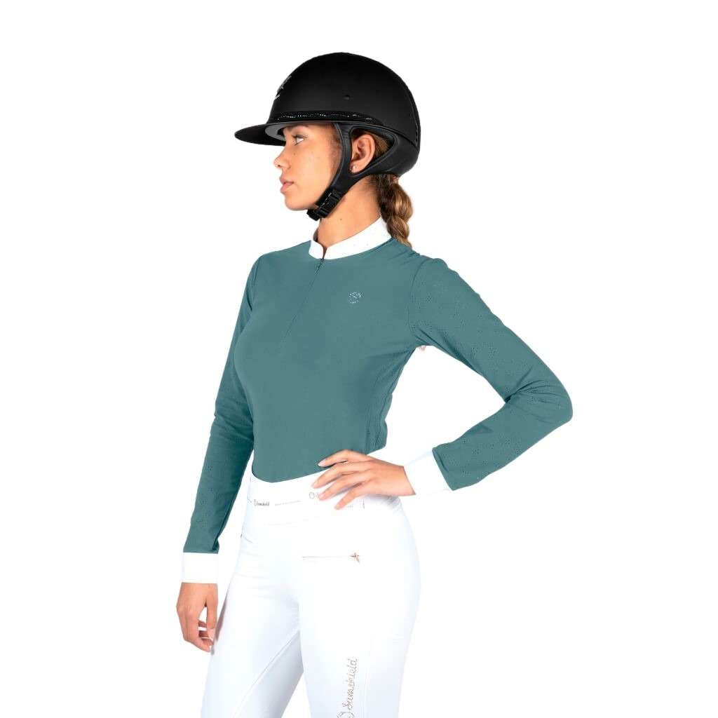 Das Turniershirt Louison stammt aus der Frühjahr/Sommer Kollektion 2022 von Samshield. Dank der Materialzusammensetzung von Polyamid und Elasthan ist das Langarmshirt besonders elastisch, schnelltrocknend und atmungsaktiv. Die Ärmel und der Rückenbereich sind aus einem perforierten Stoff, daher ist es besonders luftig. Dank dem UV-Schutz eignet es sich besonders für sonnige und warme Turniertage. Verschlossen wird das Shirt durch einen verdeckten Reißverschluss, welcher ein einfaches Öffnen und Schließen ermöglicht. Das Logo auf der Brust besteht aus Swarovski® Crystals. Zudem verfügt es über ein Logo auf dem Kragen im Nackenbereich, welches mit Nieten bestückt ist. Die kleinen Swarovski® Crystals am Kragen verleihen dem Shirt ein elegantes Aussehen. Dank des knitter- und pillingfreien Materials ist das Shirt besonders pflegeleicht, da es sich in der Waschmaschine waschen lässt.