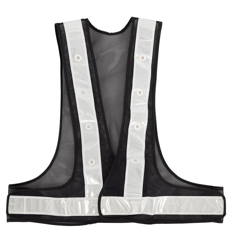 Die Weste enthält einen reflektierenden, weißen Streifen, um die Sichtbarkeit zu erhöhen. Die LED-Leuchten sind auf der Rückseite rot und auf der Vorderseite weiß. Die Lichter haben nicht weniger als drei Modi: schnelles Blinken, langsames Blinken und kontinuierlich eingeschaltet. Auf der Innenseite der Weste befindet sich eine Tasche mit Velcro Verschluss für den Batteriehalter mit Ein-/Aus-Taste für die Leuchten. Batterien sind nicht im Lieferumfang enthalten