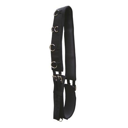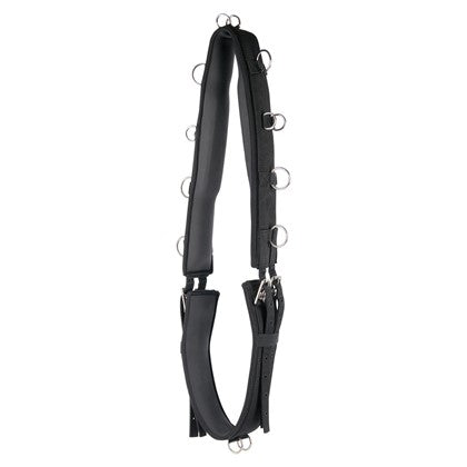 Luxuriöser Longiergurt mit Neoprenfutter. Der Longiergurt ist mit 12 Ringen versehen; zwei davon befinden sich auf der Unterseite. An beiden Seiten mittels Rollschnallen verstellbar.