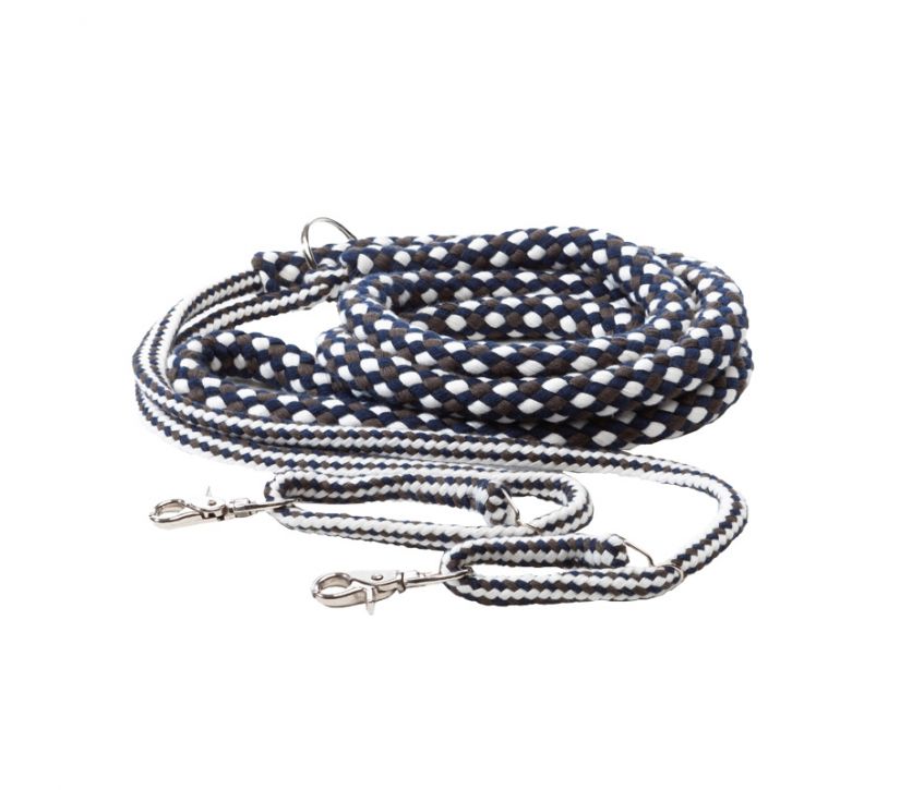 Die Longierhilfe aus einem reißfesten Polypropylenseil ist ideal für das Vorwärts-Abwärts-Arbeiten des Pferdes an der Longe. Der sehr dicke und weiche Baumwollüberzug verhindert Scheuerstellen. Mit Karabinerverschlüssen. Beidseitig verstellbar.
