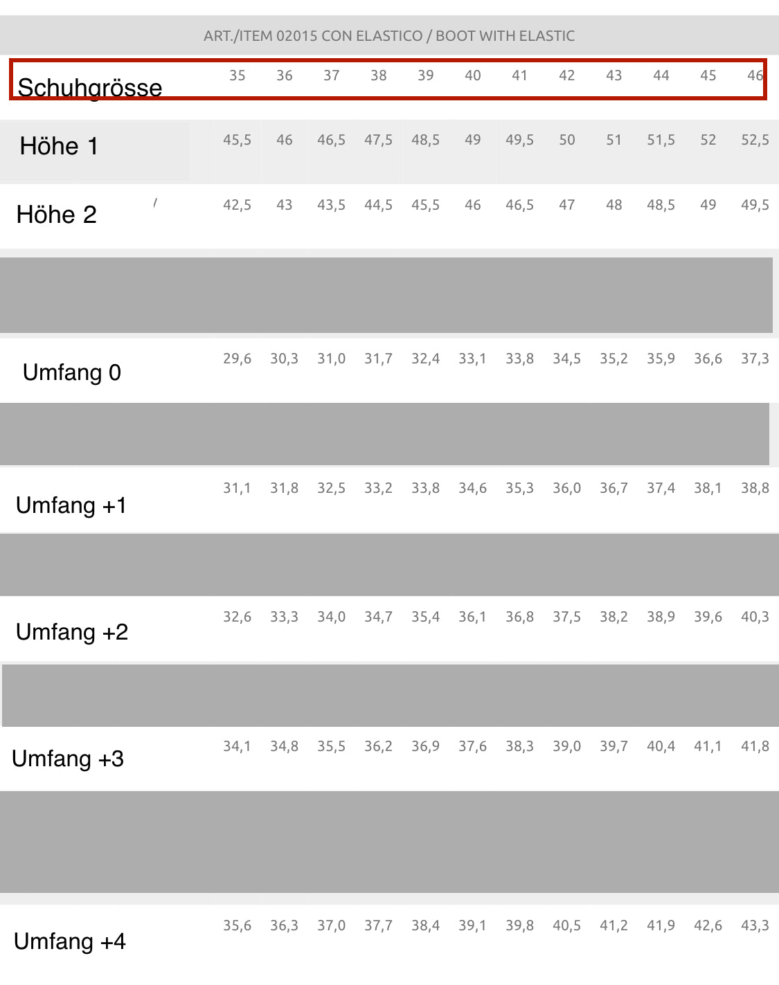 Der Umfang wird an der breitesten Stelle der Wade gemessen und die Höhe hinten vom Fersen bis unter die Kniekehle. Achtung, der Stiefel wird sich noch 1-2cm senken. Dies bei der Höhe beachten.