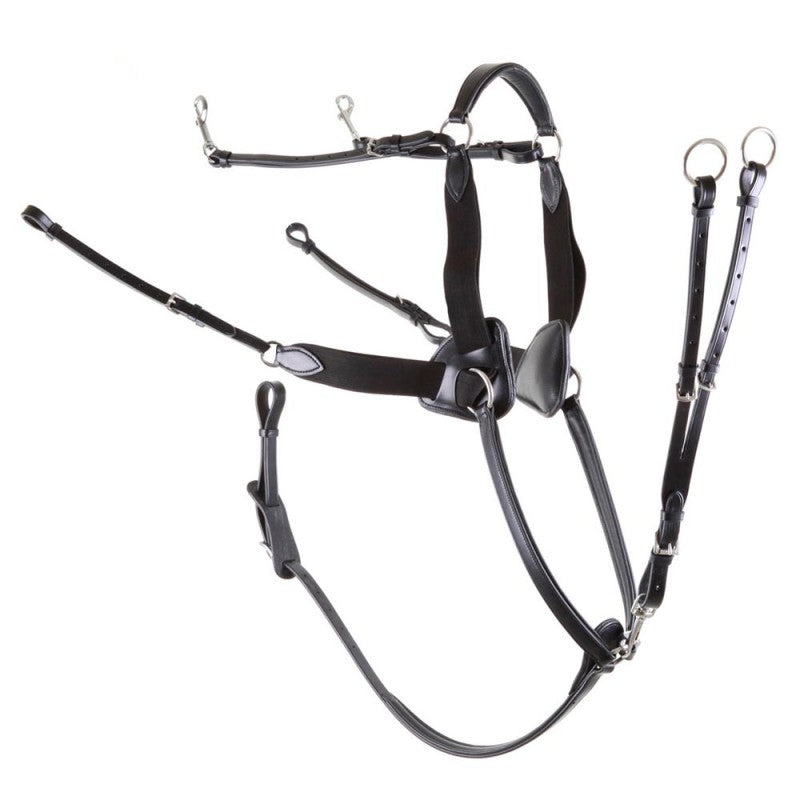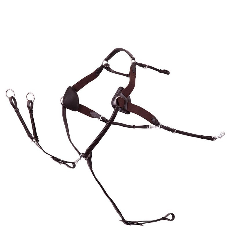 Das Premiere Vorderzeug ist ein 5-Punkt Ledervorderzeug mit Elastik. Es hat eine abnehmbare Gurtschlaufe mit Schnallenverschluss und eine abnehmbare Martingalgabel. Das Martingal ist weich unterlegt. Das Vorderzeug hat Elastikeinsätze von der Schulter zum Widerrist und von der Schulter zum Sattel die dem Pferd mehr Bewegungsfreiheit geben. Zusätzlich hat das Vorderzeug verstellbare Lederriemen mit Wirbelkarabinern die an den Fallringen befestigt werden können. Die dreieckigen gepolsterten Schulterteile geben mehr Komfort. Das Vorderzeug ist mit verstellbaren Lederriemen mit Schnallenverschlüssen an den Gurtstrippen befestigt. Ein Vorderzeug wird verwendet um die Sattellage zu stabilisieren ganz besonders bei Springen und Vielseitigkeit.