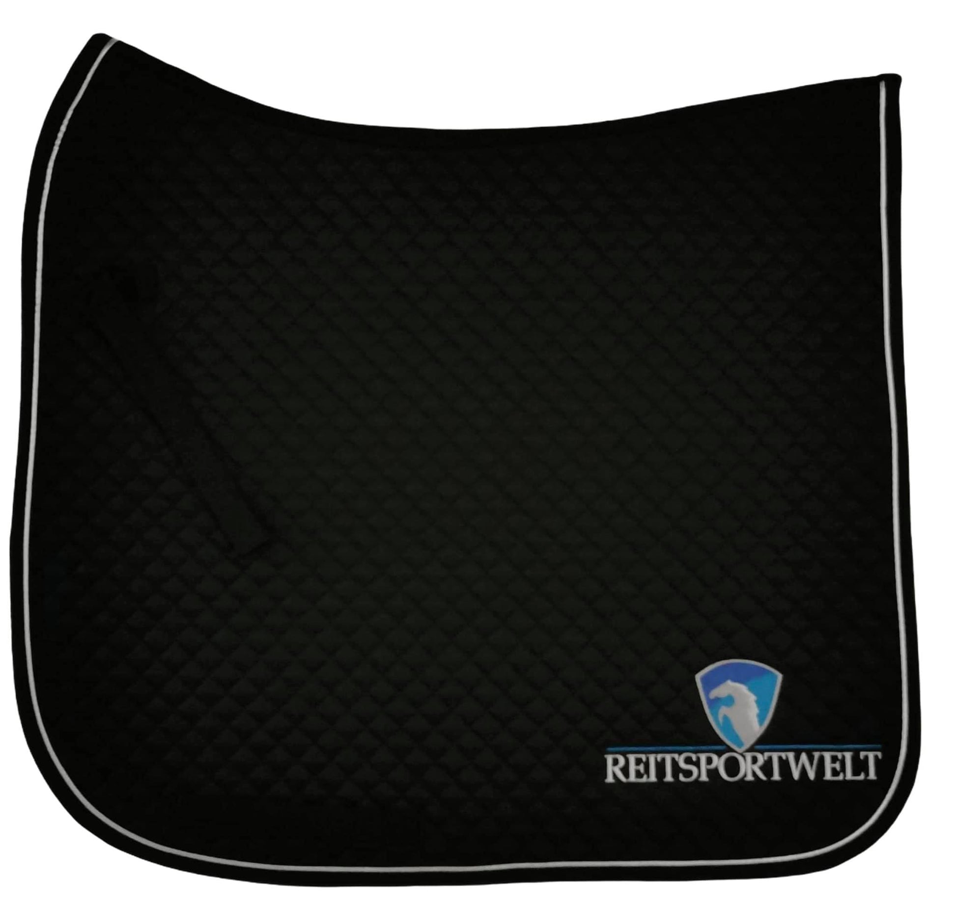 Hochwertige Schabracke mit silbriger Bise und dem einseitig gestickten Reitsportwelt Logo.