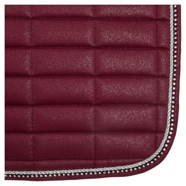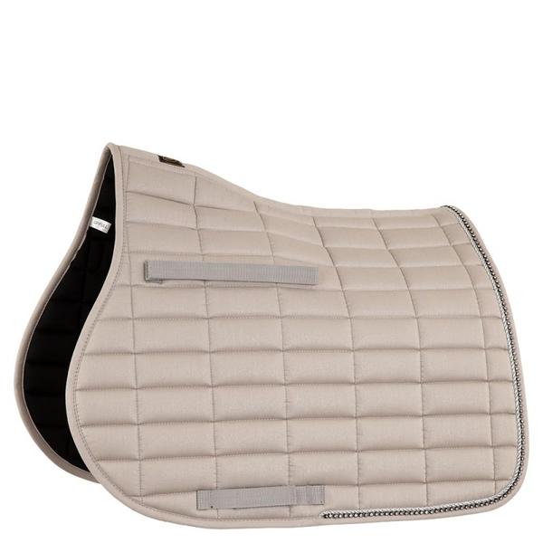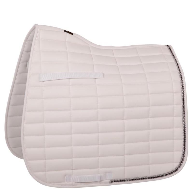 Schicke, vorgeformte Schabracke aus Polyester Baumwolle mit einem Polyester-Airflow Futter. Die Schabracke hat eine 300 g Polyfill Füllung und 10 mm Schaumpolster. Mit quadratischer Steppung, 10 x 5 cm. Sie hat einen silbernen Kordeleinfass und eine Biese mit Strass. Gurtstrippen- und Sattelgurtbefestigung mit Klettverschluss.