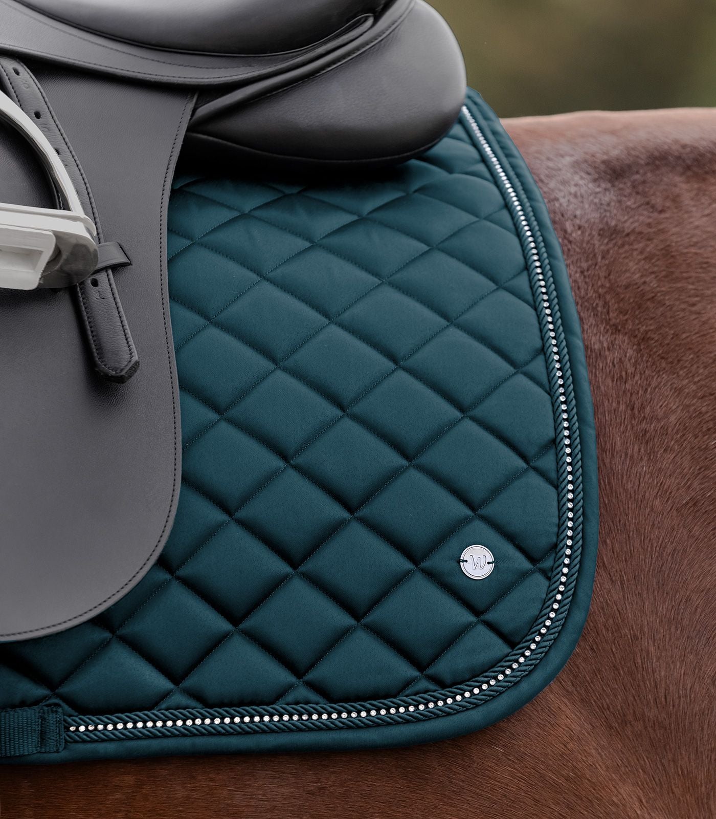 Elegante, hochwertige Schabracke im Glossy Material. Ein besonderes Detail ist das schimmernde Strassband zwischen zwei Zierkordeln. Das Logo wird in Form eines silbernen Metallplätchens dargestellt. Passend zu unser Nepal Kollektion.