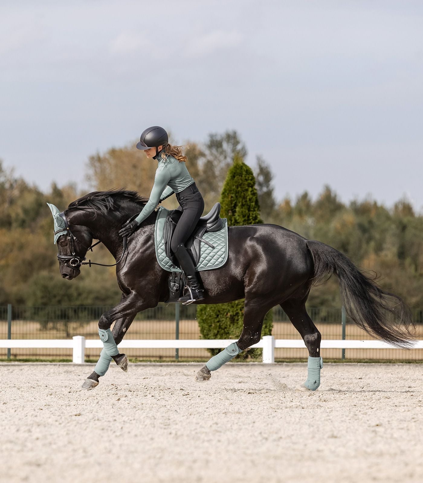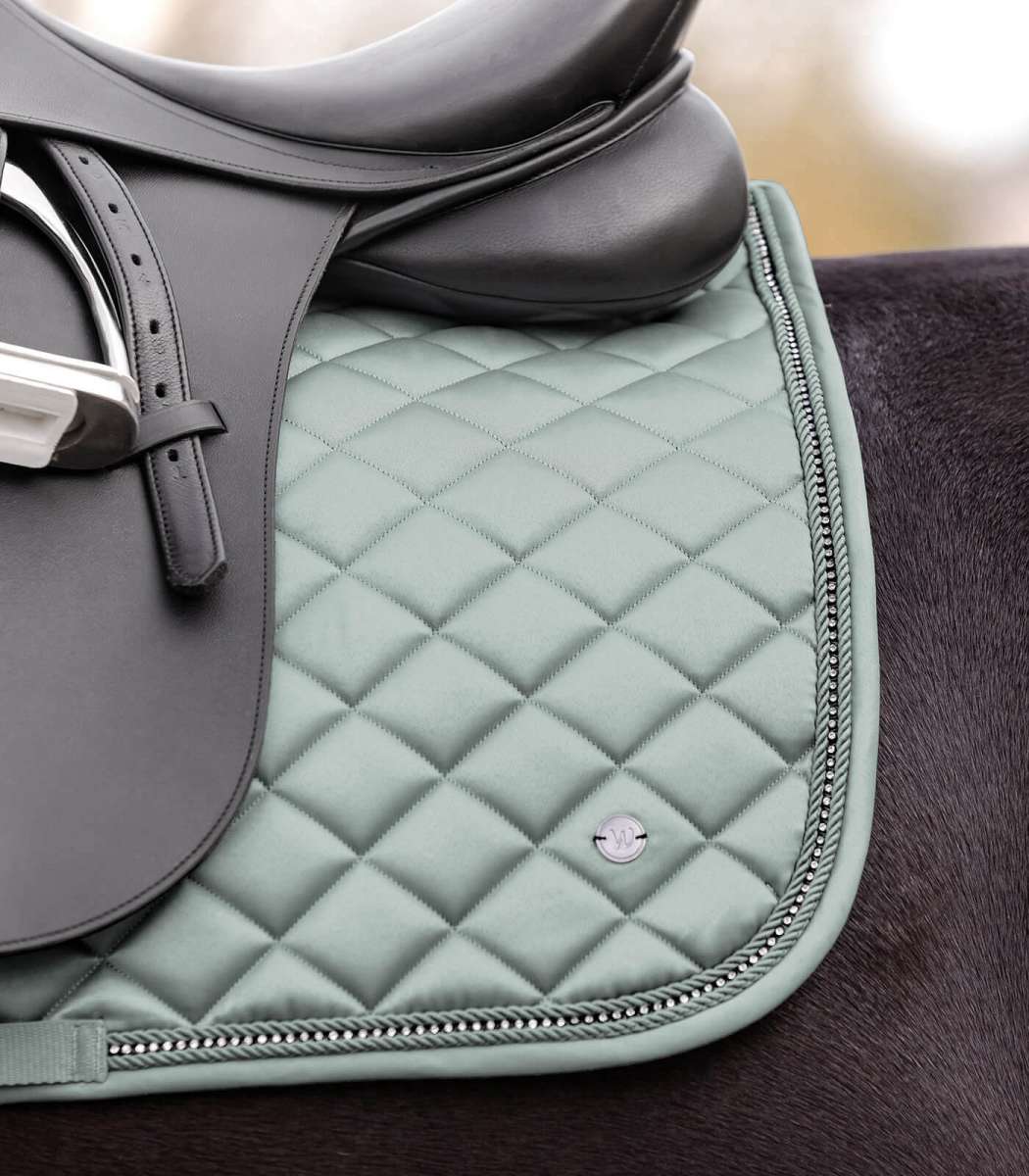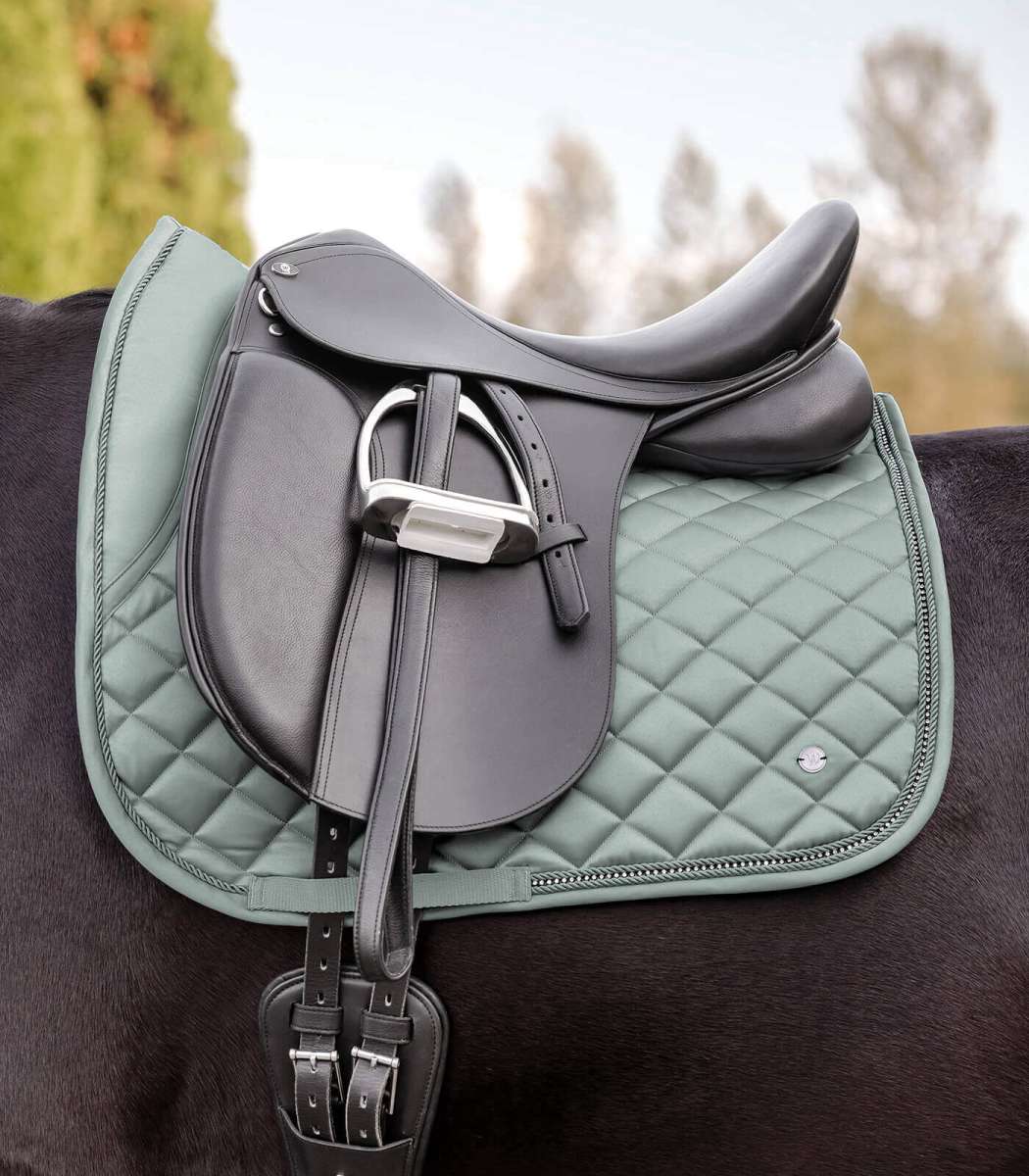 Elegante, hochwertige Schabracke im Glossy Material. Ein besonderes Detail ist das schimmernde Strassband zwischen zwei Zierkordeln. Das Logo wird in Form eines silbernen Metallplätchens dargestellt. Passend zu unser Nepal Kollektion.