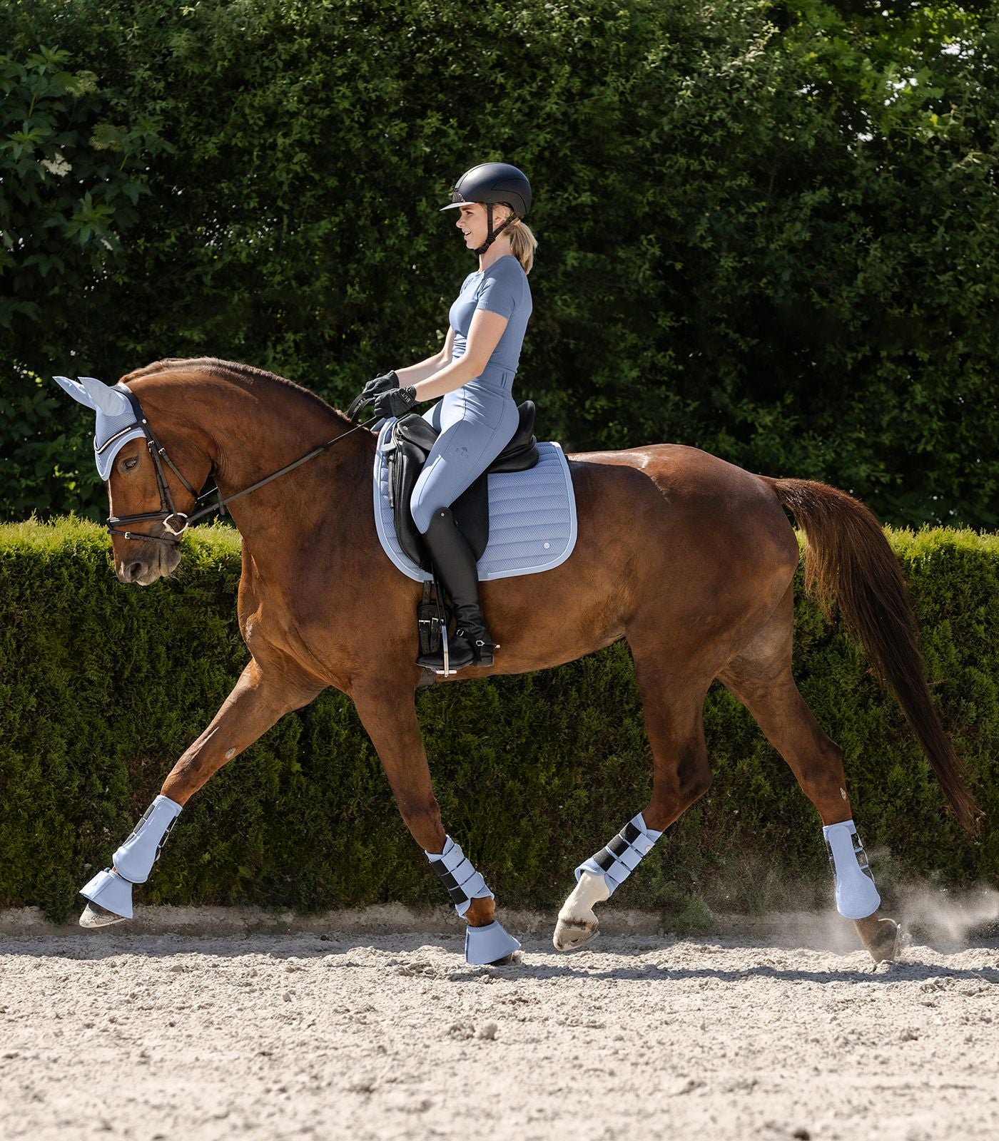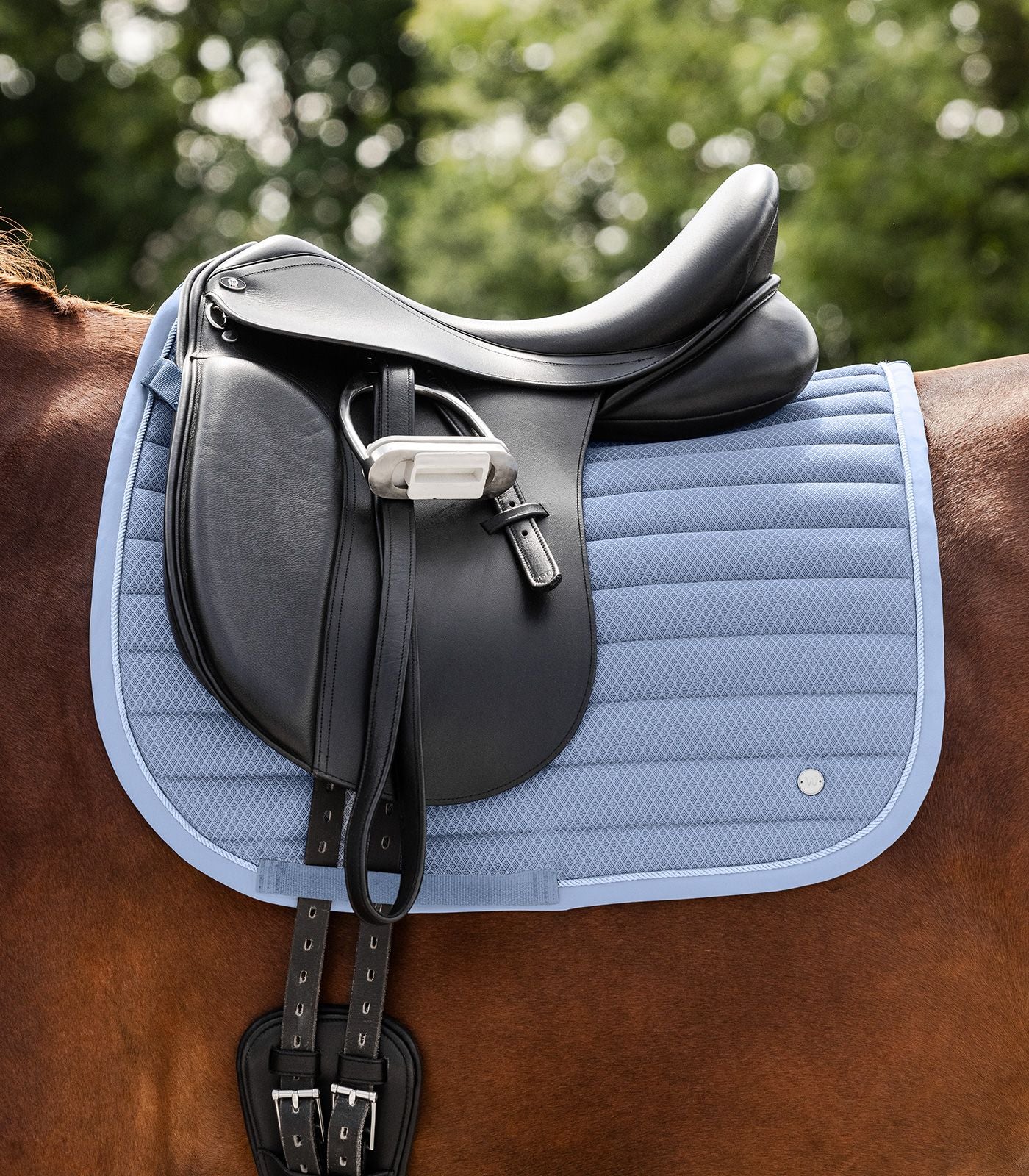 Die Schabracke Rimini bietet durch ihr Mesh Material eine maximale Atmungsaktivität. Abgerundet wird die Schabracke mit einer glitzernden Kordel, sowie einem silbernen Metallplättchen. Es kann zwischen einfachen oder unterteilten Strupfenschlaufen gewählt werden. 10 mm Schaum und 300 g/m² Wattierung gewährleisten beste Druckverteilung. Mit abnehmbaren Klettschlaufen.