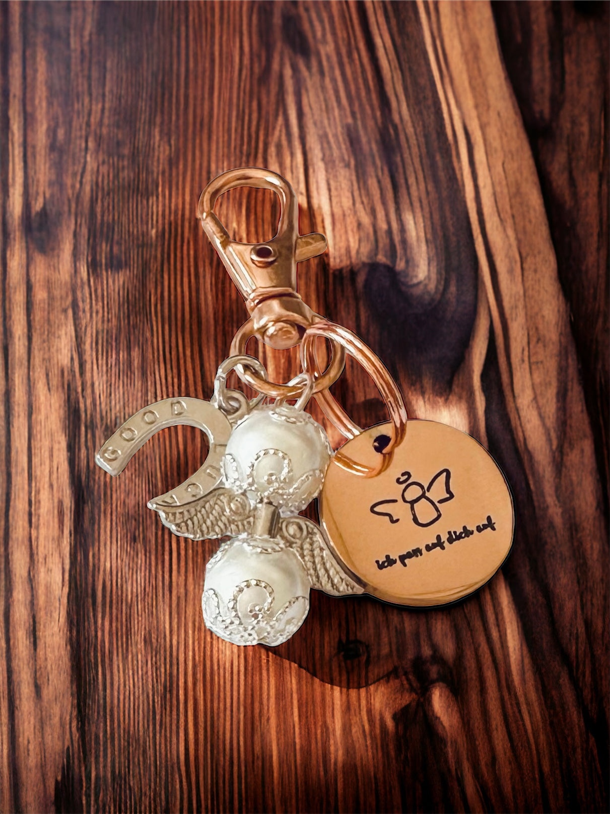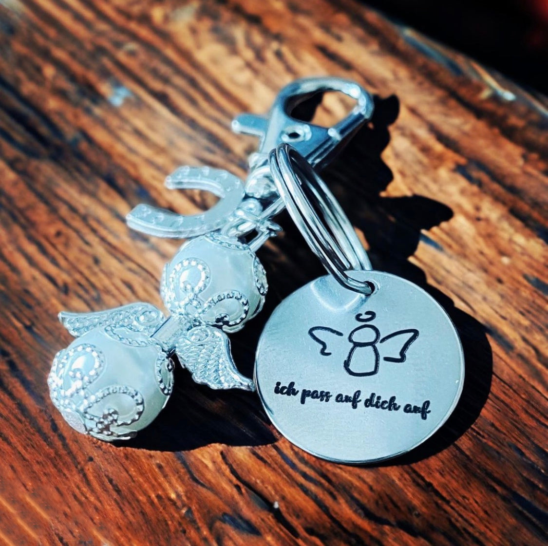 Die Vorderseite trägt die liebevolle Botschaft „Ich pass auf dich auf – liebe Grüße, dein Schutzengel“. Auf der Rückseite gravieren wir deine persönliche Ergänzung: Name, Telefonnummer oder ein Symbol, das dir wichtig ist.