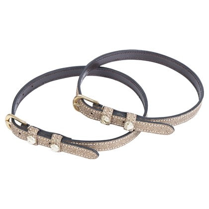 Sporenriemen aus Leder mit goldfarbenem Glitzer. Ausgestattet mit goldfarbenen Herzen an den Passanten. Goldfarbene Schnallen.
