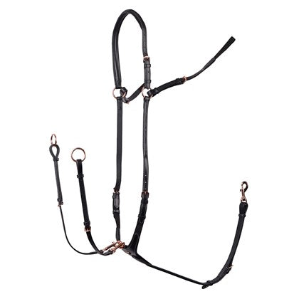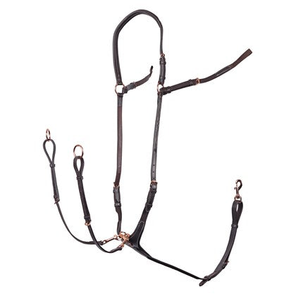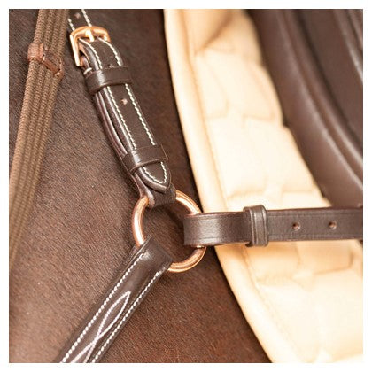 Mit abnehmbarem Martingal. Mit der verstellbaren Gurtschlaufe kann das Vorderzeug am Gurt befestigt werden.