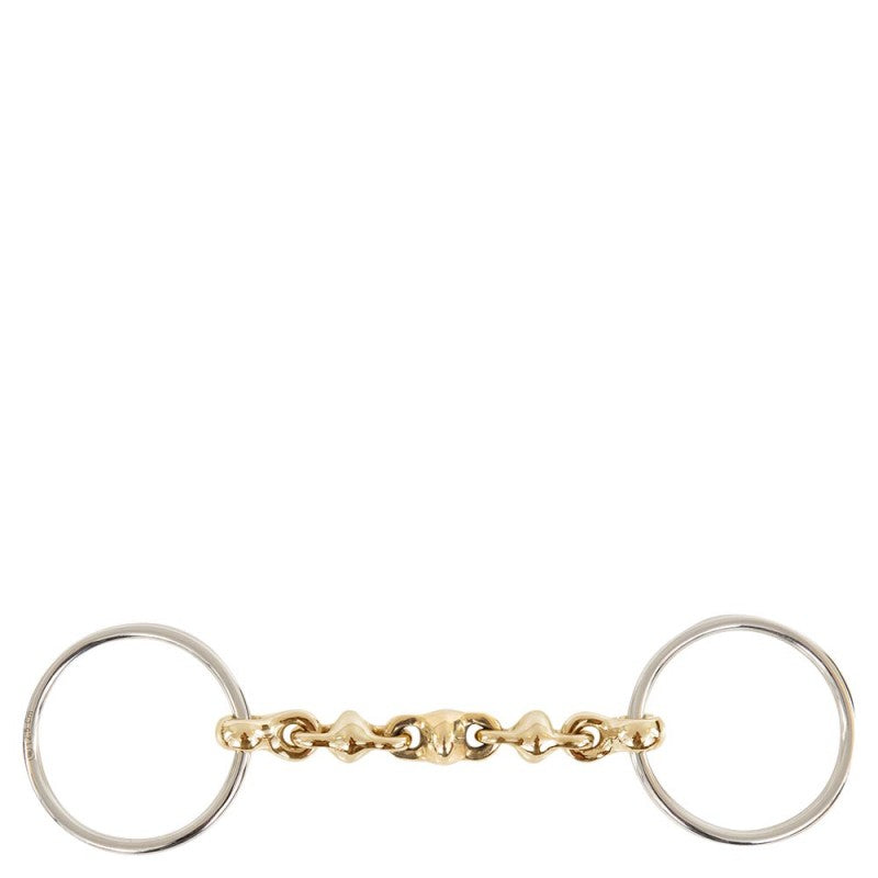 Dieses Gebiss besteht aus Edelstahlringen und einem Kugelmundstück aus Cuprion. Cuprion ist eine Legierung aus 91 % Kupfer, 5 % Zink und 4 % Silizium. Die Temperatur des Kupfers passt sich der Körpertemperatur Ihres Pferdes an. Dies stellt sicher, dass Ihr Pferd das Gebiss leichter akzeptiert. Der Oxidationsprozess des Materials ergibt einen angenehmen Geruch und Geschmack.