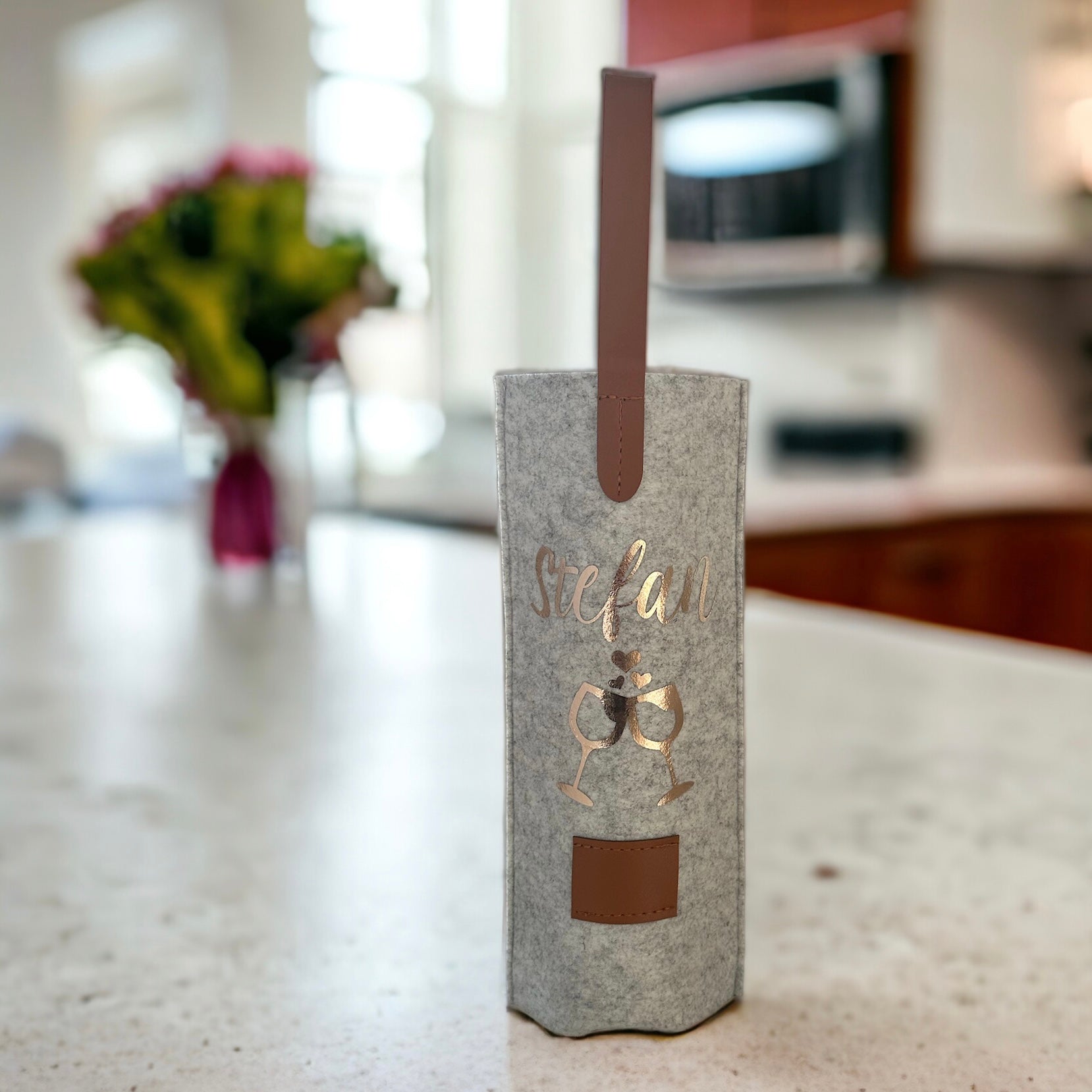 Schenken mit Liebe… personalisiere dir nach deinen Wünschen die praktische Filztragetasche für Weinflaschen und mache dein Mitbringsel zu einem ganz persönlichen Geschenk