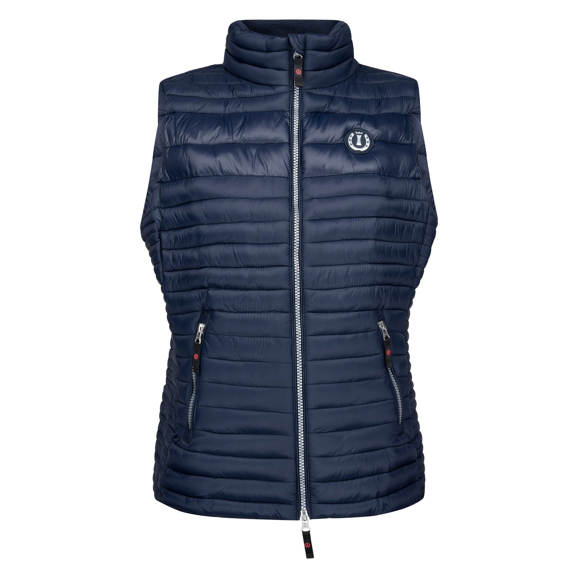 Thermoweste mit regelmäßigem, gesteppten Schlauchmuster, die mit unechten Daunenfedern gefüttert ist. Der Stoff ist metallisch beschichtet, die Vorderseite weist einen Kontraststreifen aus nicht-metallischem Stoff mit Logo-Abzeichen in Silber-Metallic an der Oberseite auf. Zwei-Wege-Reißverschlus an der Vorderseite und Reißverschlusstaschen.