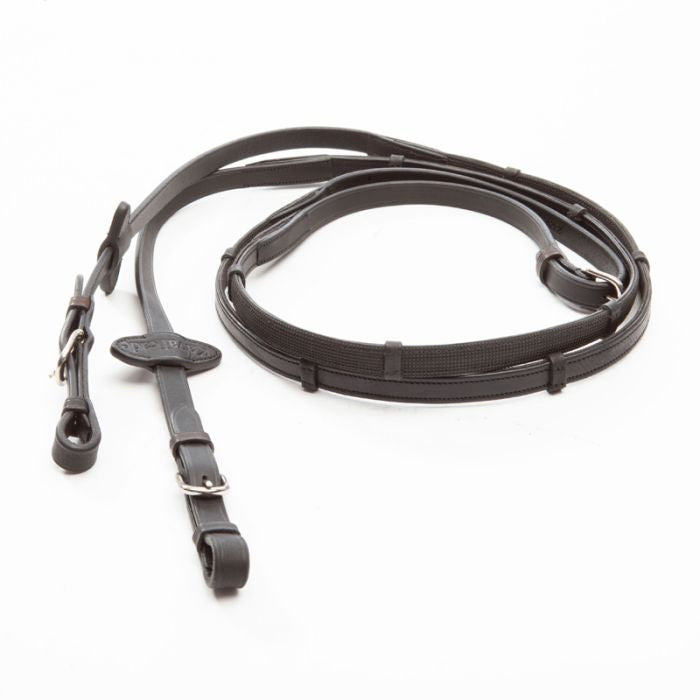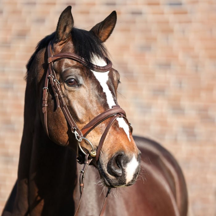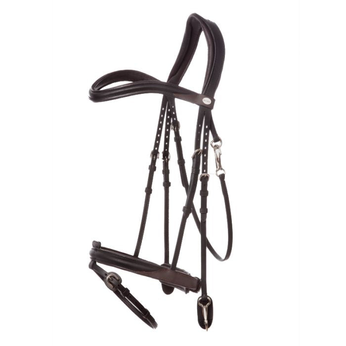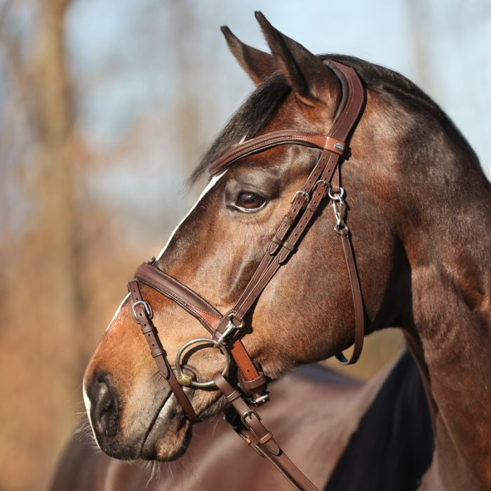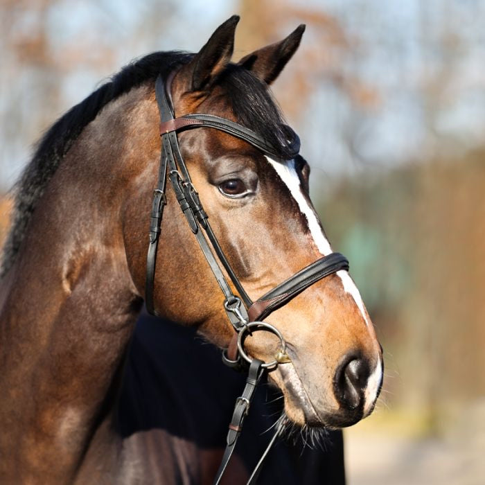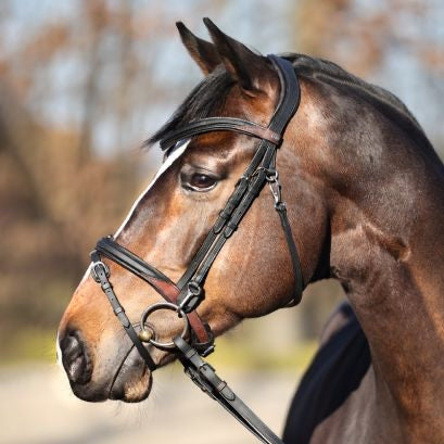 Die Trense „EveryDay“ aus geöltem Leder ist darauf ausgelegt, schnell, einfach und effektiv die Verschnallungen anzupassen und das Gebiss zu tauschen. Der Karabiner-Verschluss an den Backenstücken und am Kehlriemen sowie die größeren Schnallen und oval geformten Löcher ermöglichen den schnellen Tausch und das extra leichte Verschnallen. Aber auch im Komfort für das Pferd punktet die Trense excellent: Das besonders anatomisch geformte, sehr weich gepolsterte Genickstück mit starker Ohrenaussparung entlastet die Nervenbahnen und gibt den Ohren bessere Bewegungsfreiheit. Die weiche Polsterung vom Nasenriemen und Stirnband bieten ebenfalls einen besonderen Komfort für das Pferd. Der Sperrriemen ist abnehmbar und hat eine Lederlasche unter der Schnalle als Polster. Um Druckstellen zu vermeiden, verläuft die Öse zur Befestigung des Sperrriemens zwischen dem Nasenriemen und der Unterpolsterung entlang. Für den besonderen Look haben Nasenriemen und Stirnband elegante lederne Deko-Elemente an den Seiten. Das Reithalfter ist beidseitig verstellbar. Die Trense wird mit griffigen Softlederzügeln geliefert. Diese haben eine Gummischicht für besonders guten Halt.